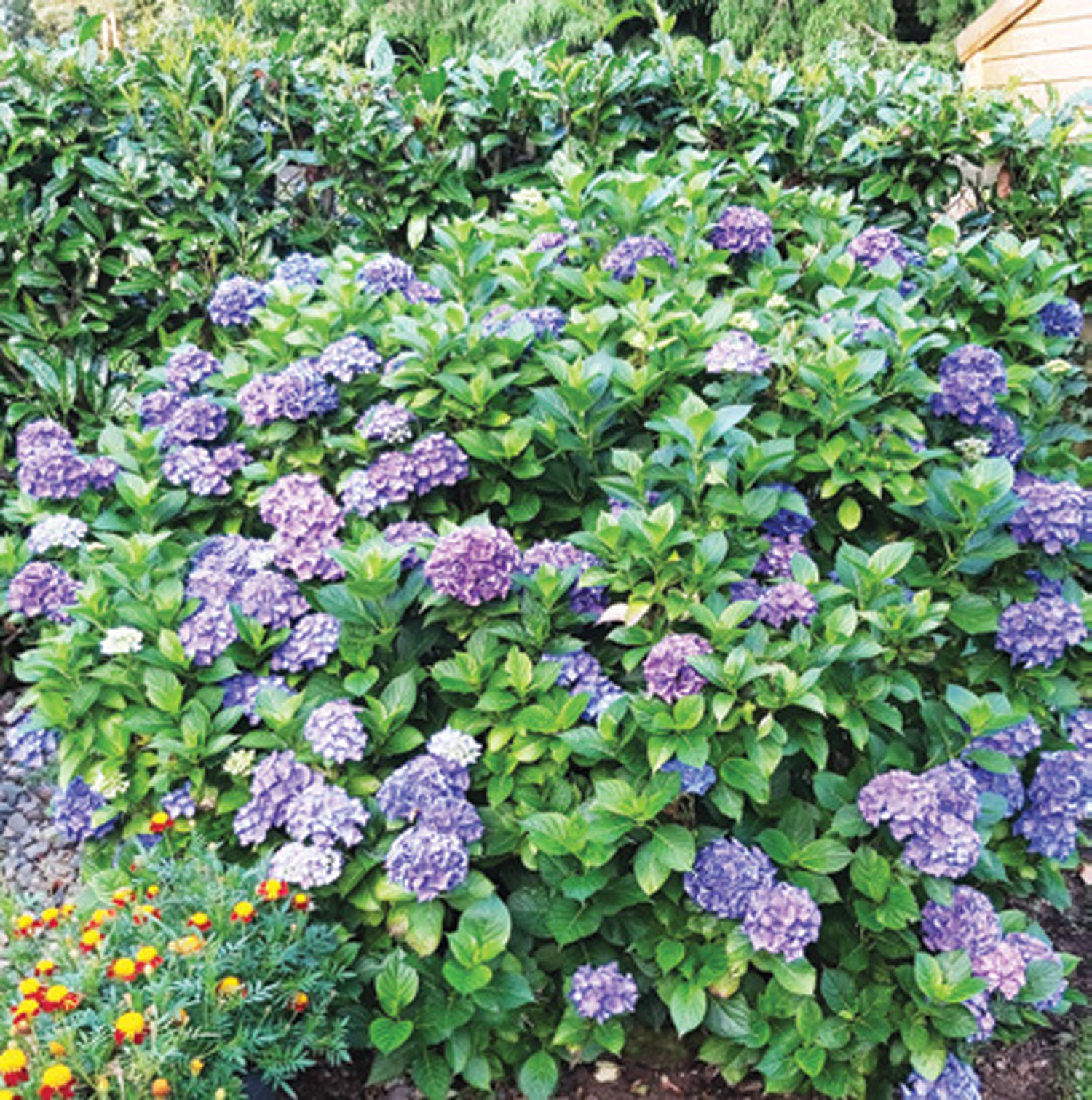 Zilā hortenzija tikai četrus gadus veca, viņai šeit ļoti patīk, jo ir skāba augsne.