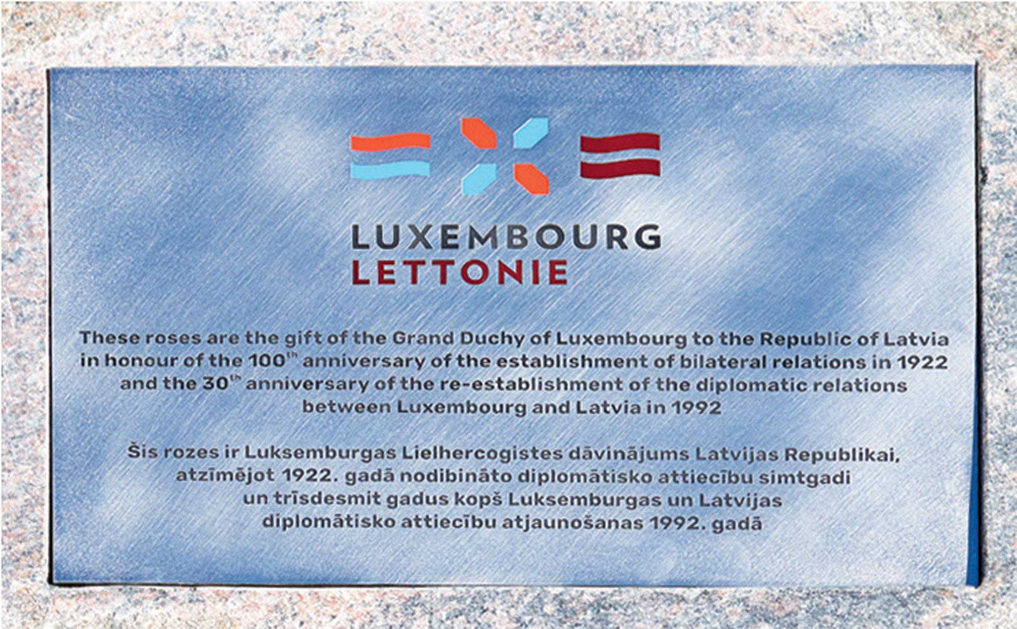 Piemiņas akmens ar tekstu: “Šīs rozes ir Luksemburgas Lielhercogistes dāvinājums Latvijas Republikai, atzīmējot 1922. gadā nodibināto diplomātisko attiecību simtgadi un trīsdesmit gadus kopš Luksemburgas un Latvijas diplomātisko attiecību atjaunošanas 1992. gadā.