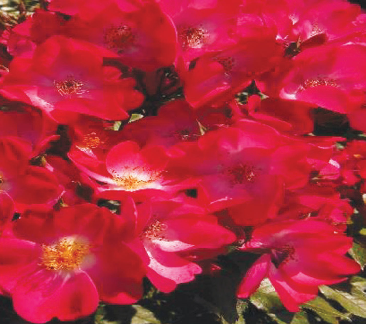 ‘Guna’. Izveidota Nacionālajā botāniskajā dārzā, apputeksnējot Rosa rugosa ‘Plena’ ar šķirņu ‘Parkdirektor Riggers’ un ‘Ābeļzieds’ putekšņu maisījumu. Autore Dzidra Rieksta. Reģistrēta 1981. gadā. Krūms piramidāli izplests, 1,2–1,5 m augsts, ar sazarotiem ērkšķainiem zariem. Lapas vidējas, spīdīgas, ādainas, krokainas, tumši zaļas. Ziedi lieli (8–10 cm diametrā), puspildīti (līdz 15–20 vainaglapas), sarkani ar purpura nokrāsu, viegli smaržīgi, pa 5–15 ziedkopā. Ziedpumpuri viegli atveras, un noziedējušie ziedi viegli nobirst. Zied ļoti bagātīgi un gandrīz nepārtraukti no jūnija sākuma līdz salnām. Ziemcietīga, Latvijā pārziemo bez piesegšanas. Izturīga pret kaitēkļiem, lietainās vasarās var ciest no miltrasas. Pavairojama ar potēšanu, grūtāk – ar zaru un sakņu spraudeņiem.