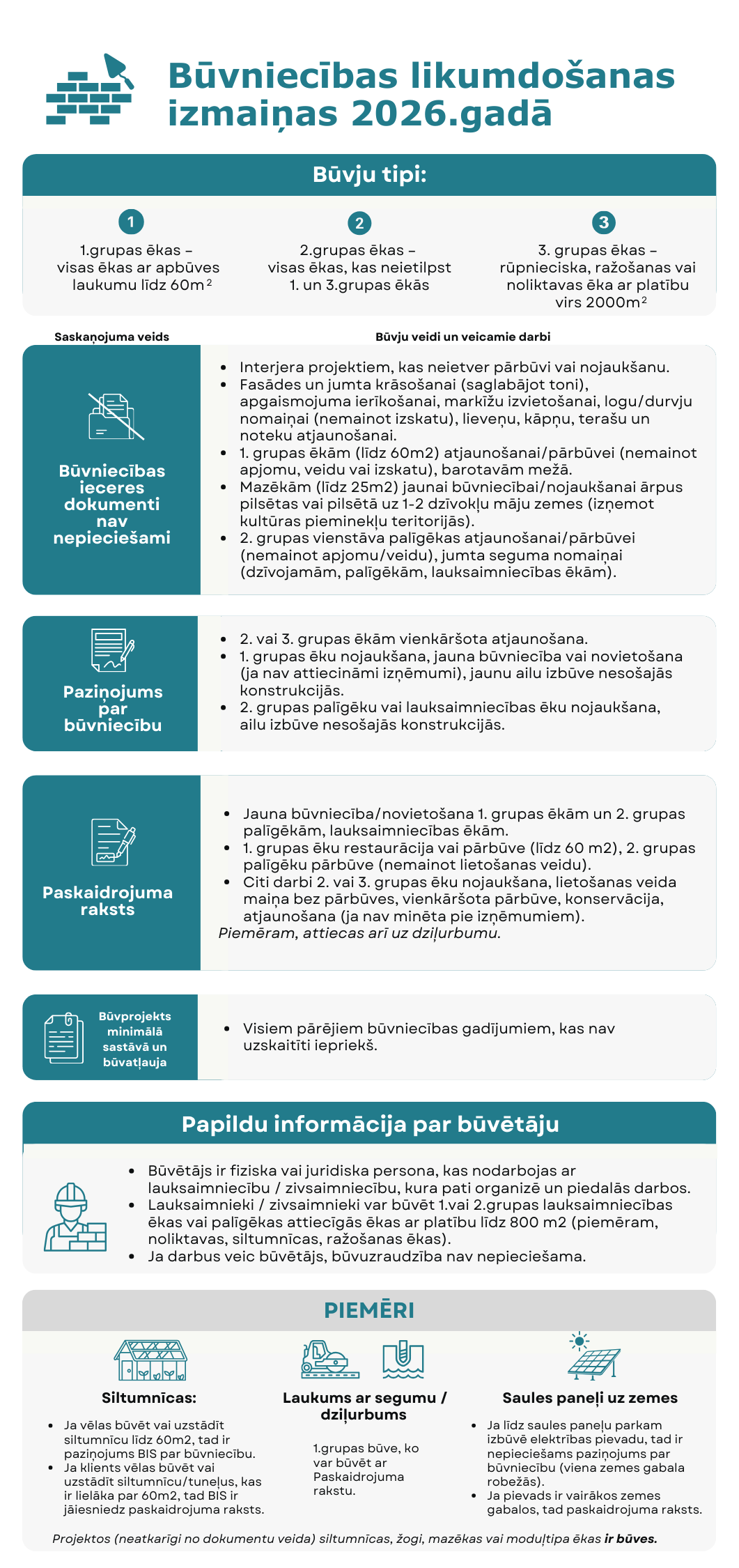 Piesakoties dažādiem atbalsta pasākumiem (intervencēm), gadījumos, ja projektā tiks veikti būvniecības darbi, jāievēro prasības būvniecības regulējumā. 2026. gadā ir vairākas būtiskas izmaiņas, kas jāņem vērā.