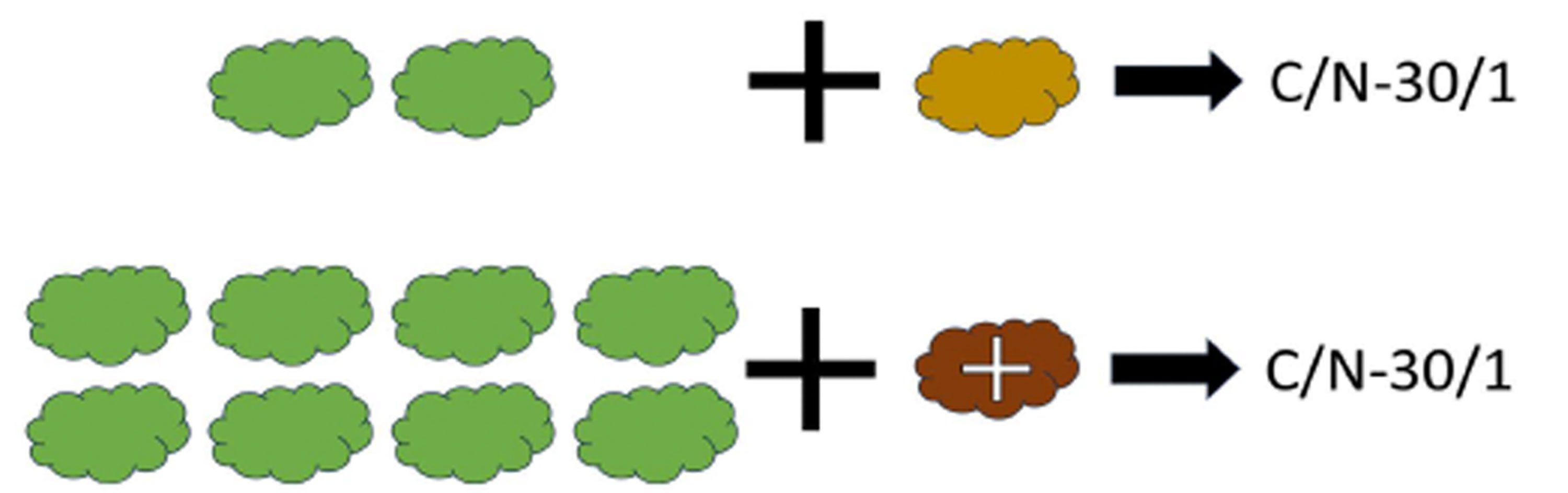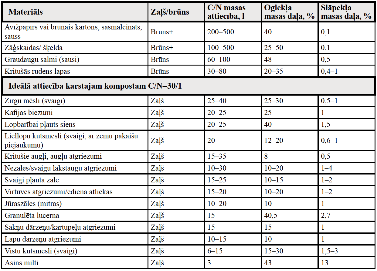 Lai iegūtais mēslu un pakaišu maisījums būtu efektīvi kompostējams karstajā procesā, C/N attiecība būtu jālīdzsvaro līdz 30/1. Tā kā liellopu mēslu ķīmiskais sastāvs variē atkarībā no govju barošanas, šoreiz pieņemsim, ka govis saņem daudz kvalitatīvas barības un to mēsli satur maksimālās iespējamās oglekļa un slāpekļa masas daļas % vērtības, kas atrodamas 2. tabulā, tāpat no 2. tabulas paņemam atbilstošās vērtības salmiem.