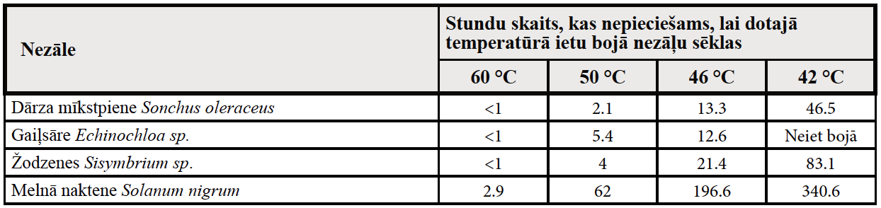 1. tabula. Dažu nezāļu sēklu karstumizturība