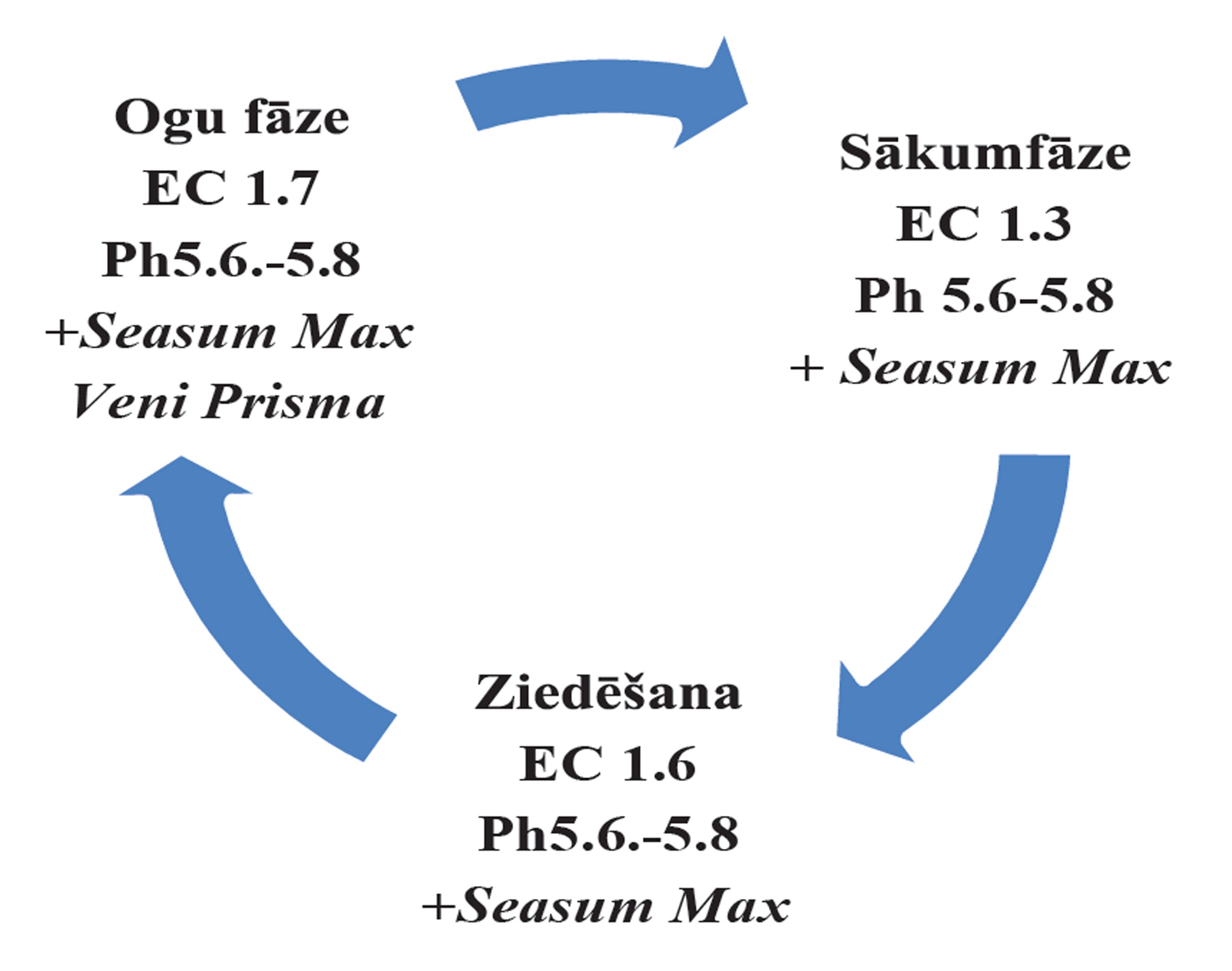 Mēslošana tika nodrošināta pēc iepriekš izstrādātas mēslošanas shēmas, vadoties pēc auga attīstības fāzēm (AS 00 – AS 97 VAAD, noverojumi.vaad.gov.lv), divas reizes audzēšanas gaitā tika veiktas lapu analīzes, lai papildus kontrolētu mēslošanas līdzekļu nepieciešamību.