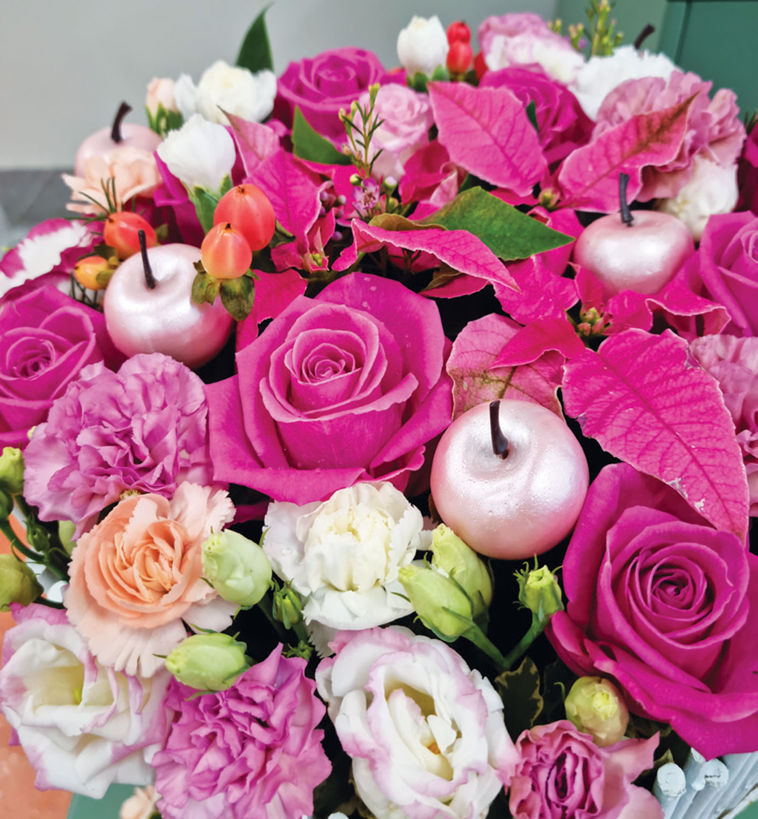 Reti kurš rozā toni asociē ar Ziemassvētkiem. Ja galda noformējuma kompozīciju gatavo tortes formā, balti krāsoti, it kā apsniguši zari var veidot tortes malas, bet augšu – kopā ar rozēm un lizantēm – mazas rozā puansetijas podiņos. Lai dažādotu faktūras, akcentam izmantoti gludi rožaini mākslīgie ābolīši. Kopskats Ziemassvētkiem neparasts, taču grezns un interesants.