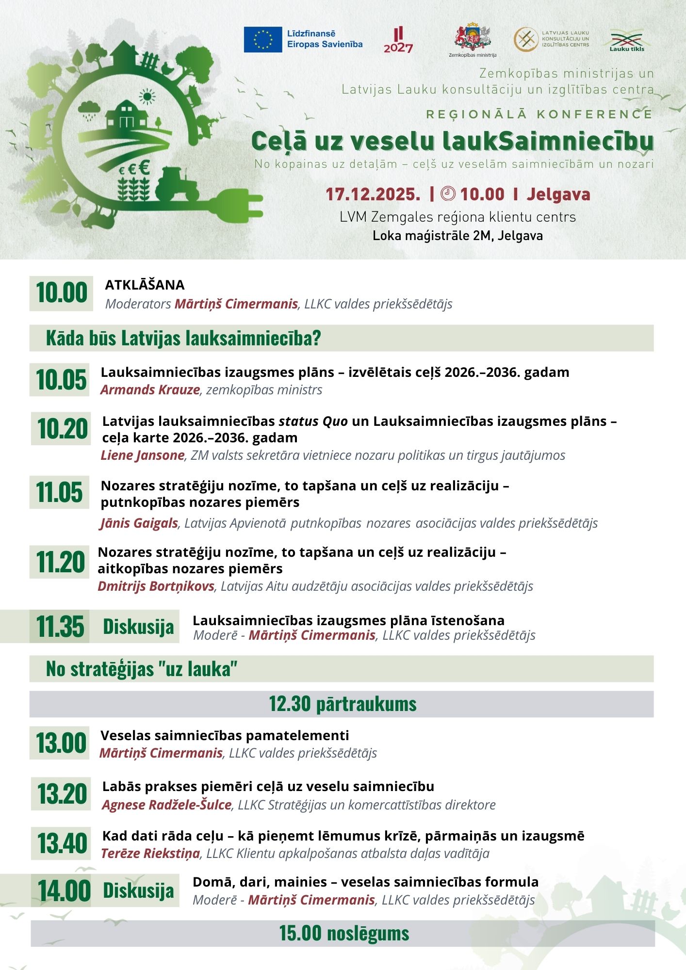 Konferencē piedalīsies zemkopības ministrs Armands Krauze, ZM, LLKC un nozares eksperti. Plānotas arī dalībnieku diskusijas par lēmumu pieņemšanu gan nacionālā, gan saimniecību līmenī, lai kopā veidotu pamatu veselīgākai un gudrākai saimniekošanai.