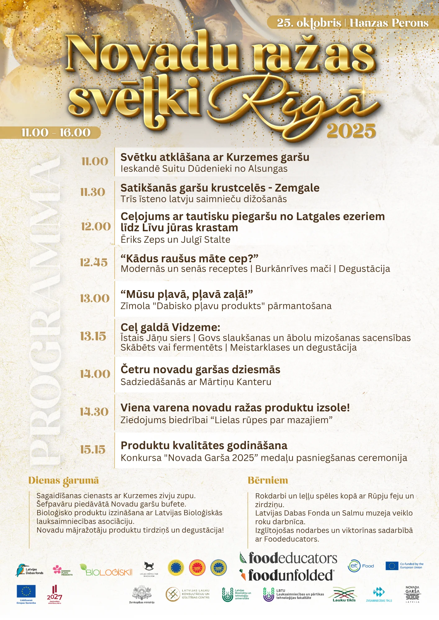 Visas dienas garumā – dažādi ēdieni un dzērieni ar Latvijas novadu smeķi! Rokdarbi un leļļu spēles kopā ar biedrības “Lielas rūpes par mazajiem” Rūpju feju un zirdziņu, Latvijas Dabas fonda un Salmu muzeja veiklo roku darbnīca. Apmeklētāji varēs būt arī klātesoši Dabisko Pļavu zīmola pārmantošanas ceremonijā un uzzināt, kam šis zīmols tiek piešķirts un kādi produkti ar to marķēti. Tikmēr Latvijas Bioloģiskās lauksaimniecības asociācija ikvienam piedāvās “Bio ābolu izaicinājums kopā ar BIOLOĢISKI”. Tā būs sacensība garākās ābolu mizas mizošanā ar jaukām balviņām!