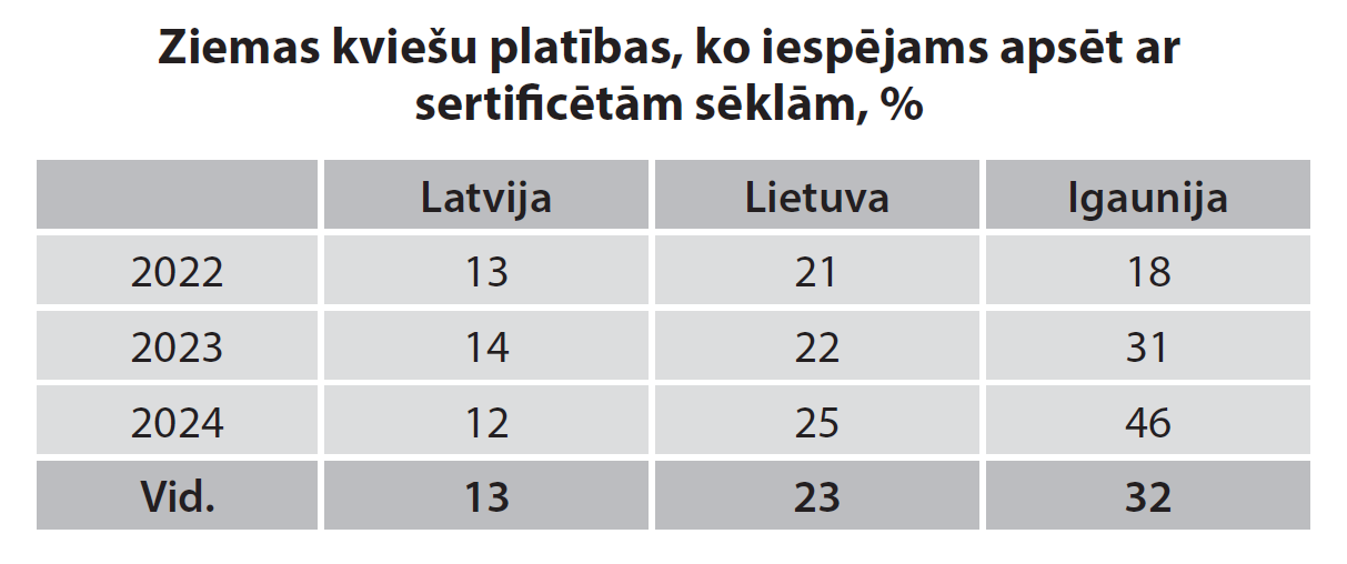 Lai gan sertificētu sēklu izmantošanas priekšrocības ir zināmas un vispāratzītas, mūsu valstī tās lieto maz. Latvijā vairāk audzētā graudaugu kultūra ir ziemas kvieši. Vidēji pēdējos piecos gados ar sertificētajām sēklām gadā var apsēt tikai 13 % no ziemas kviešu kopplatības, tātad teju 90 % kviešu Latvijā izaudzēti no nesertificētas sēklas. Ar pārējām graudaugu kultūrām ir līdzīgi. Diemžēl šajā ziņā būtiski atpaliekam no kaimiņvalstīm Igaunijas un Lietuvas, nemaz nerunājot par citām Eiropas valstīm. Zviedrijā un Dānijā, piemēram, ar sertificētām sēklām tiek apsēti 70–90 % graudaugu platību.