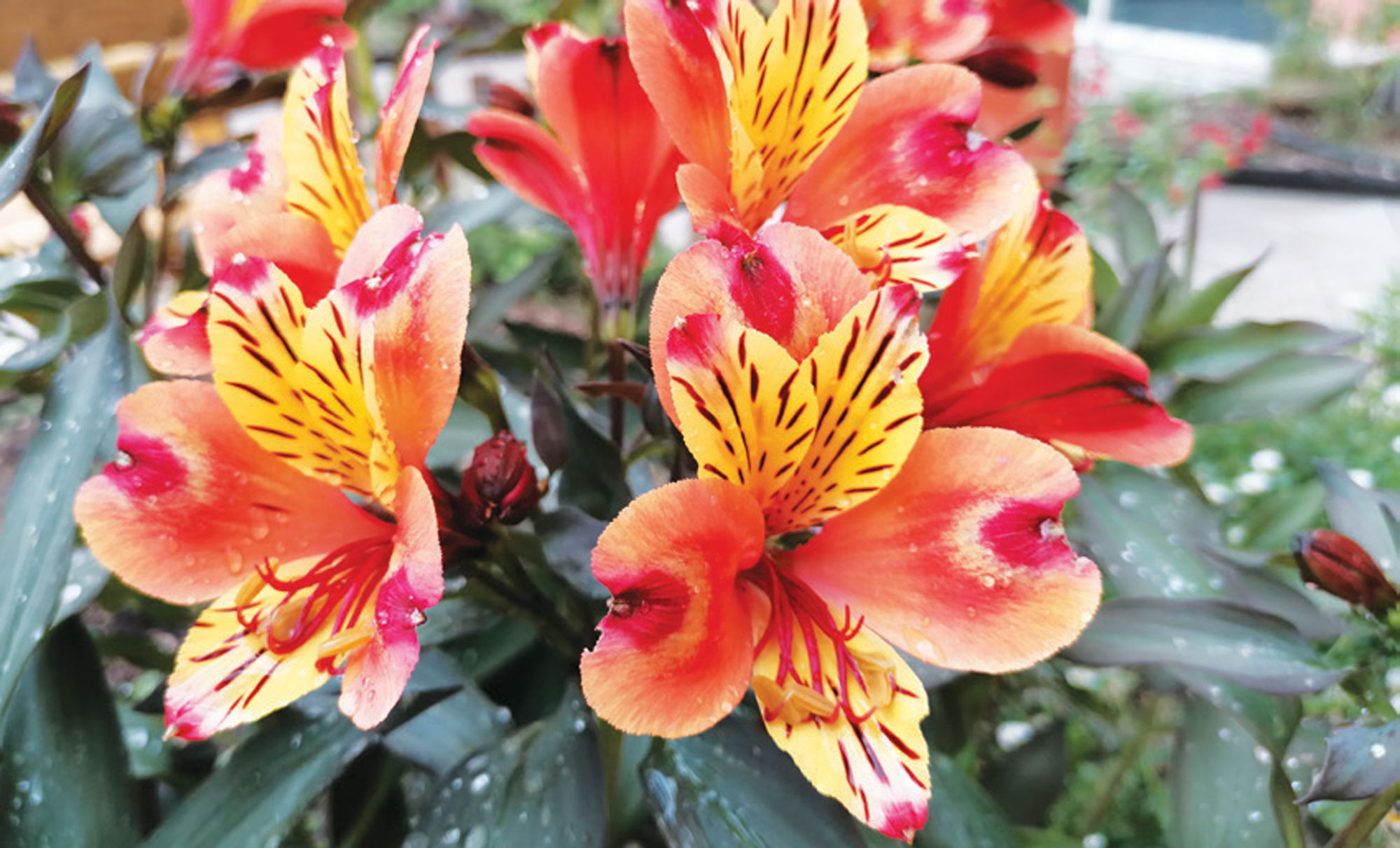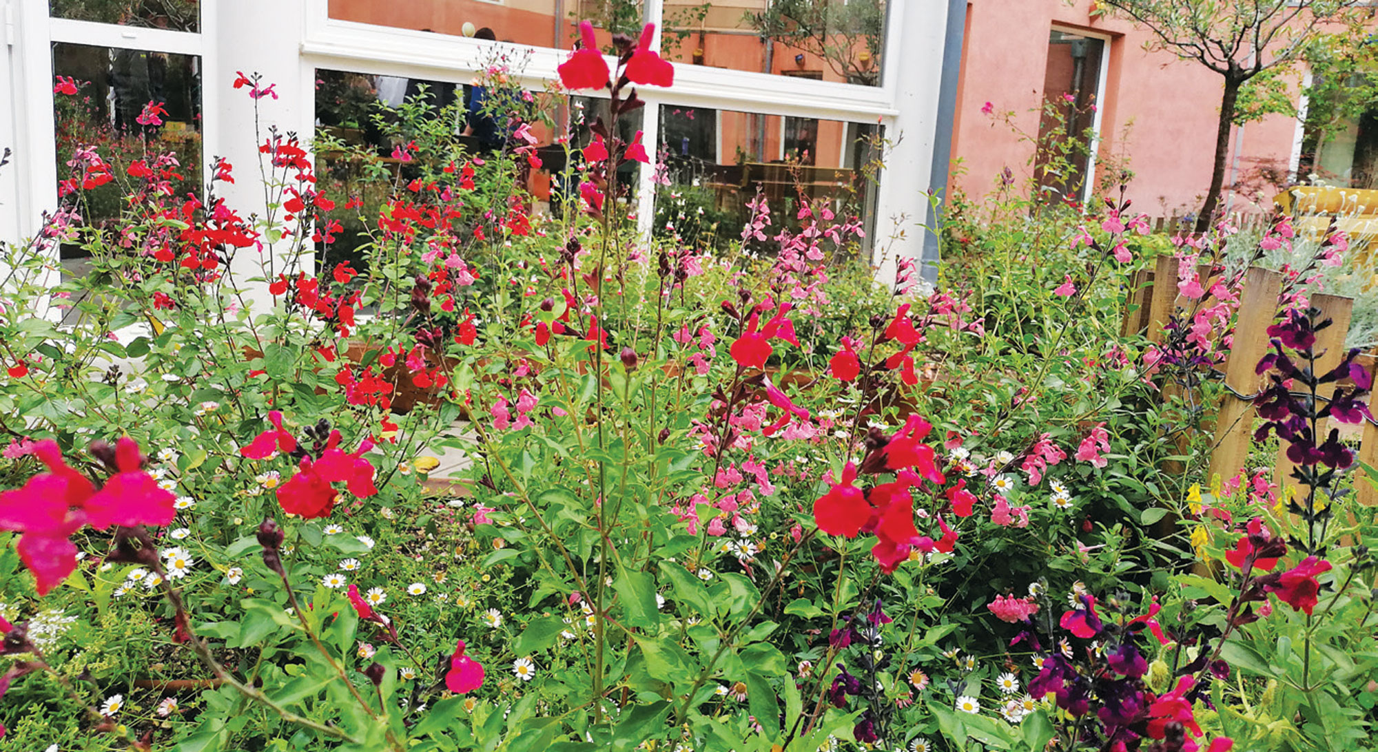 Alstroemērija pansionāta dārzā – krāsu laukumi saskaņoti ar ēku toni.