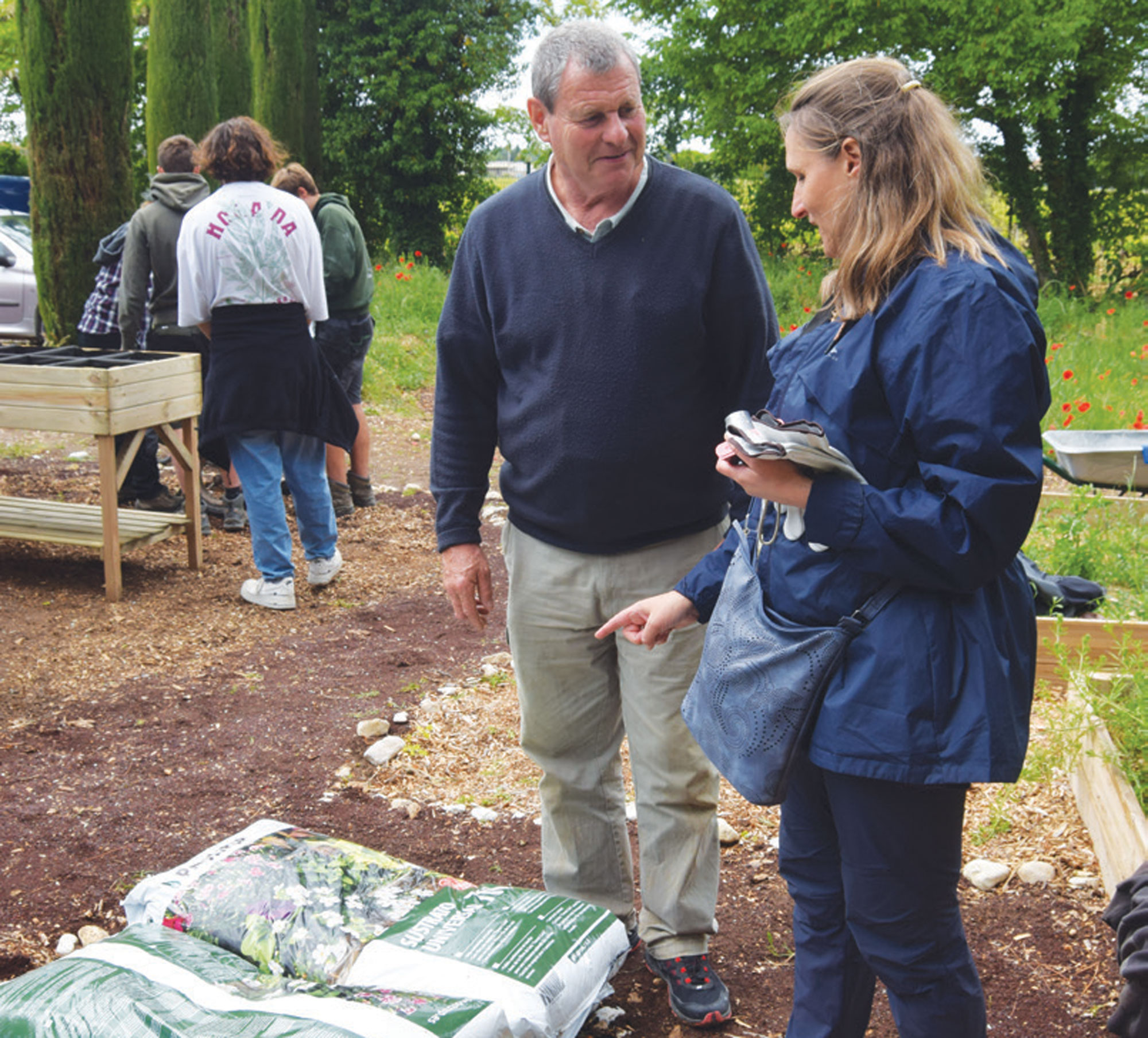 Filips Velšs un Gunta Jēkabsone praktiskajā nodarbībā skolas dārzā.