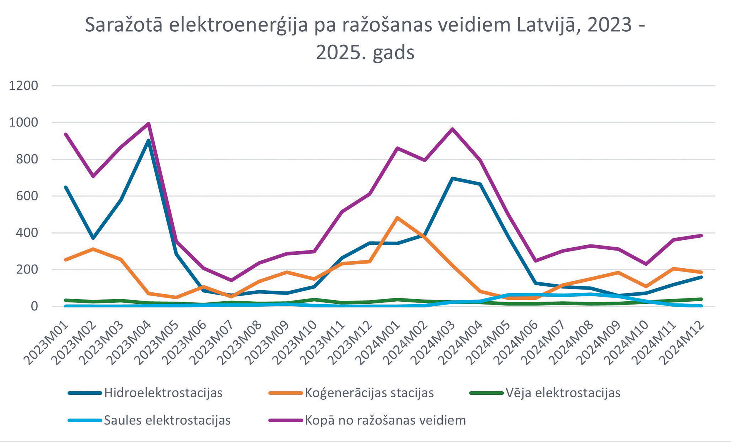 Tomēr, raugoties tuvplānā, paveras raibāka aina. Enerģijas ražošanas apjomi būtiski svārstās pa mēnešiem – to skaidri atklāj analīzē iekļautais grafiks. Ziemā elektroenerģijas ražošanu nodrošina koģenerācijas stacijas, kas vienlaikus ražo arī siltumu. Pavasarī darbu uzņemas hidroelektrostacijas – palu ūdeņu laikā tās sasniedz maksimālo jaudu, īpaši Daugavā. Vējš Latvijā strādā vienmērīgi, taču tā īpatsvars elektroenerģijas grozā joprojām ir neliels. Savukārt vasara izrādās visklusākais periods – par spīti saules paneļu attīstībai vismazāk saražotās elektroenerģijas.