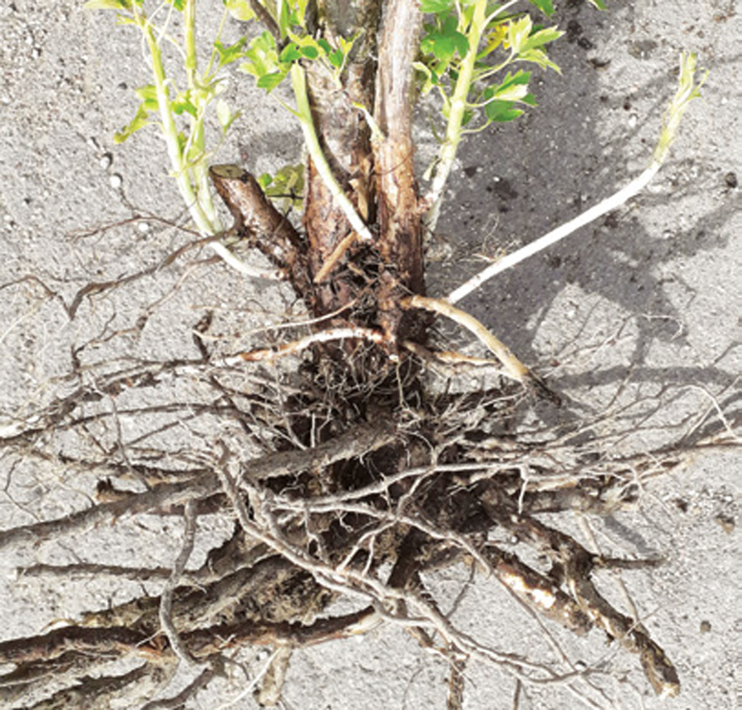Sakņu sistēma 3 gadus vecam augam, kur var redzēt, kā veidojas kakleņa dzinumi un sakņu atvases.